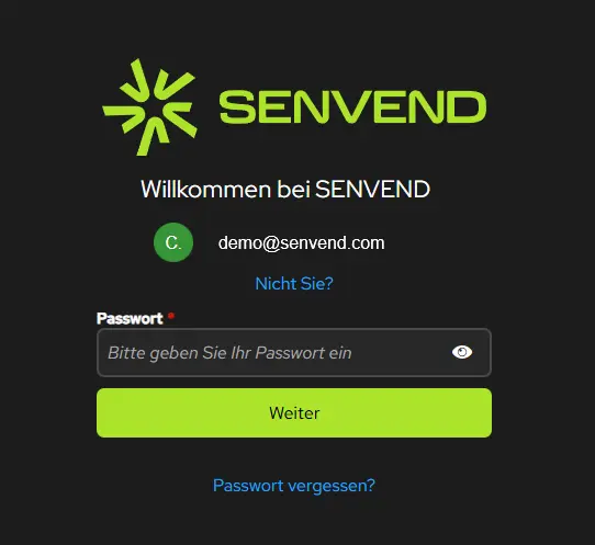 Für die Anmeldung nutze deine Anmeldedaten vom Onboarding, die du bei der ersten Registrierung auf www.senvend.com erstellt hast.