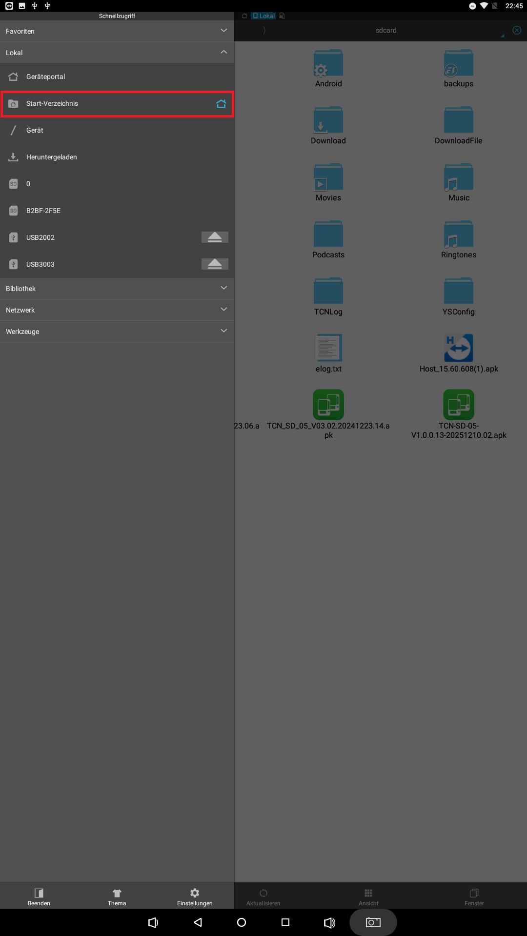 9. Wieder die Drei Balken oben Links auswählen und in das Startverzeichnis wechseln