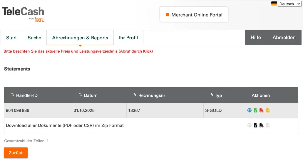 3. Klicke in der Spalte Aktionen auf einen der Links, um die gewünschten Abrechnungen einer Abrechnungsperiode herunterzuladen (Links nach Dateiformat: HTML, CSV, PDF, XML, jeweils als ZIP-Datei gepackt).